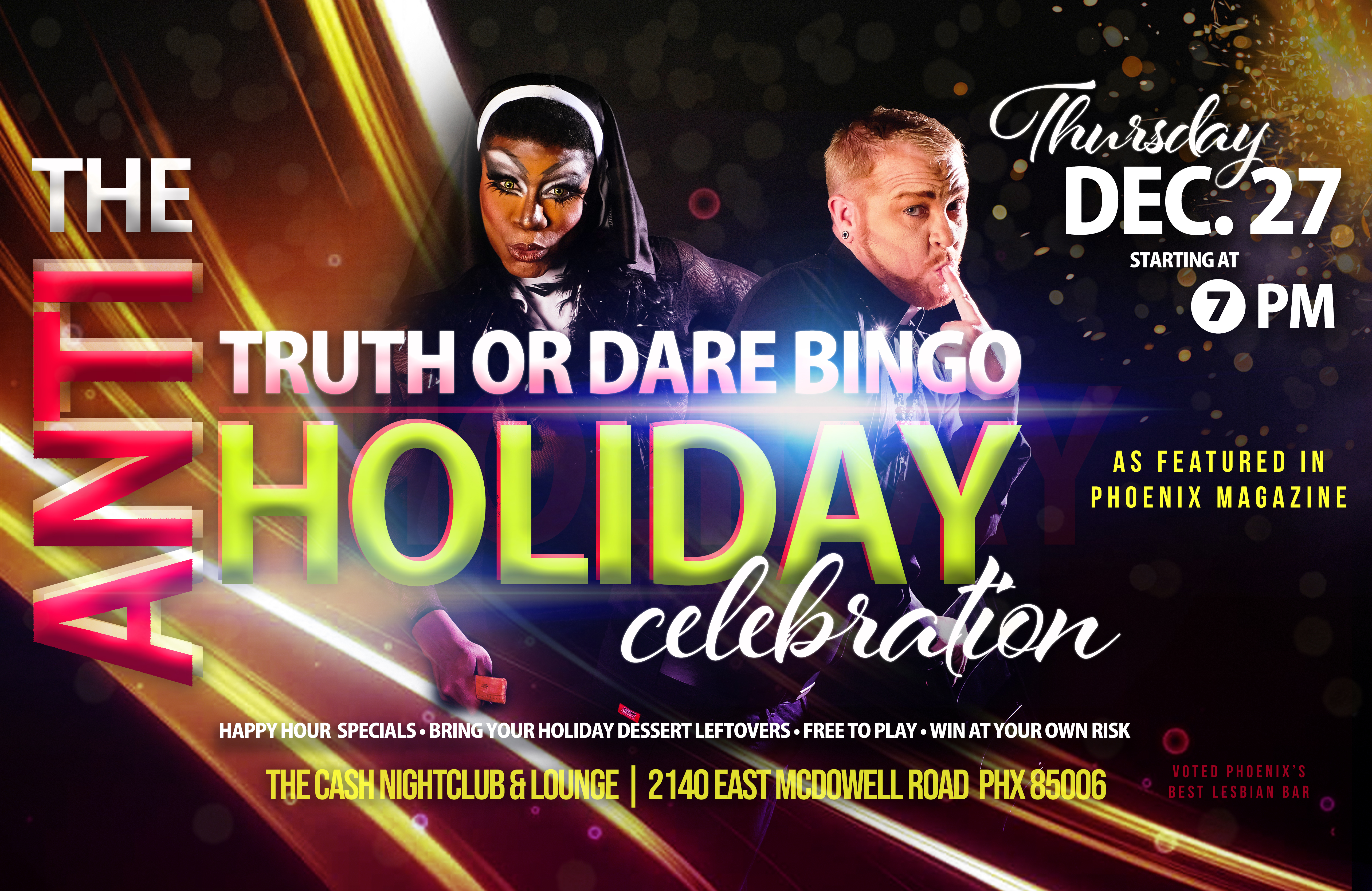 Tonight (12/27) join Freddy Prinze Charming and me at The Cash Nightclub & Lounge in Phoenix at 7 p.m. for “The Anti-Holiday Celebration” of Truth or Dare Drag Bingo.