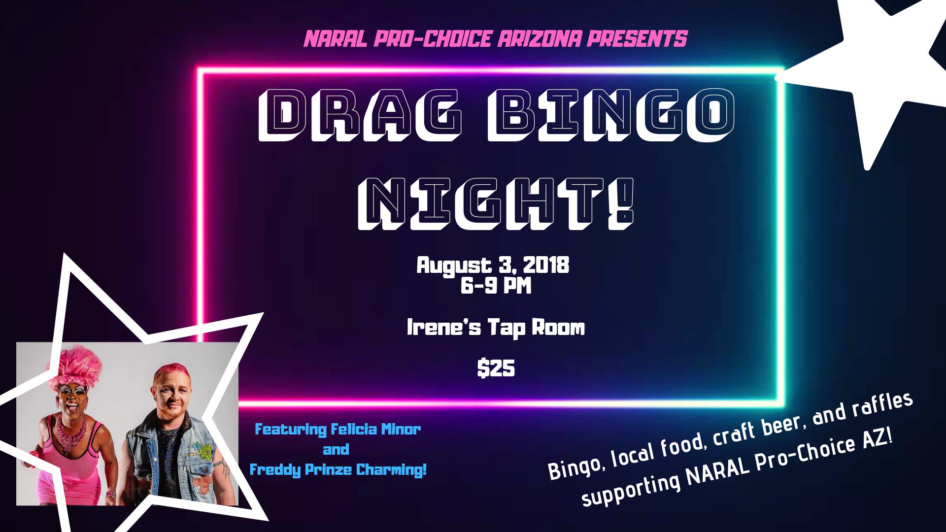 Join Freddy Prinze Charming and myself for Drag Bingo Night at Irene’s Tap Room in Phoenix to raise money for NARAL Pro-Choice Arizona on Sat., Aug. 3. Price: $25, benefiting abortion access in Arizona!