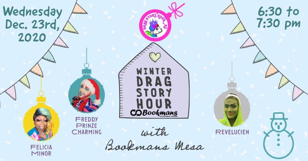 Join Freddy Prinze Charming, Revelucien and me for the Bookman’s Mesa Winter Drag Story Hour on Wednesday, December 23, 2020 from 6:30 to 7:30 p.m. on the Drag Story Hour – Arizona Facebook page.