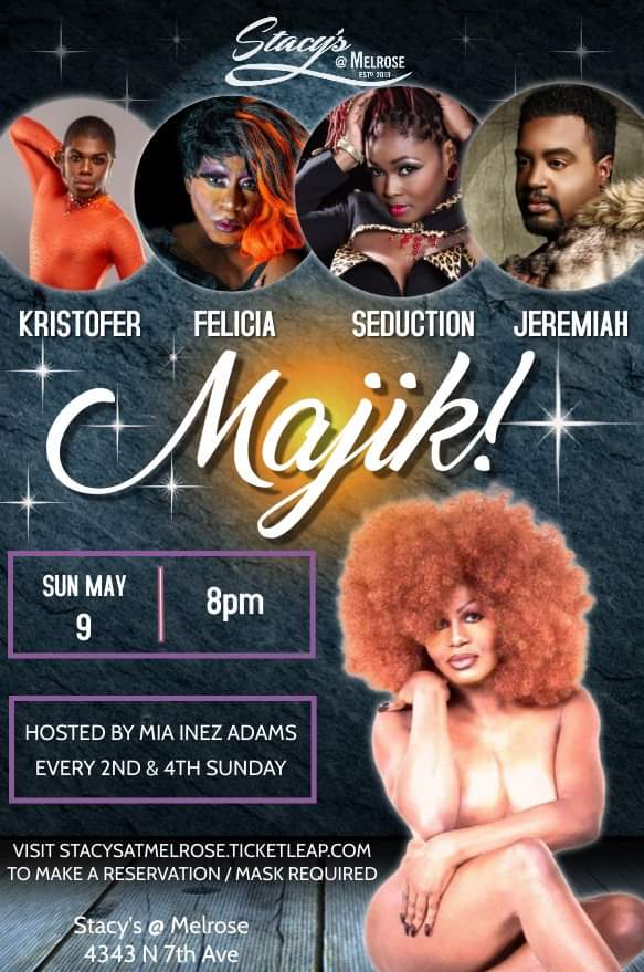 Join Mia Inez Adams and the all-star cast of MAJIK! for not just a show, but an experience at Stacy’s at Melrose today (May 9) on Mother’s Day! Celebrate with Mia Inez Adams, Kristofer V. Lee, Jeremiah Daniels, Seduction Dickerson and me!
