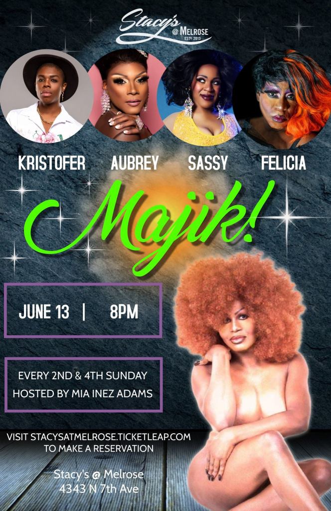 You’re invited to join me as part of the cast of Majik hosted by Mia Inez Adams at Stacy’s at Melrose on Sunday, June 13 at 8 p.m. The next installment of the experience features Kristofer V. Lee, Aubrey O’Night, Sassy C. Diazz, and me.