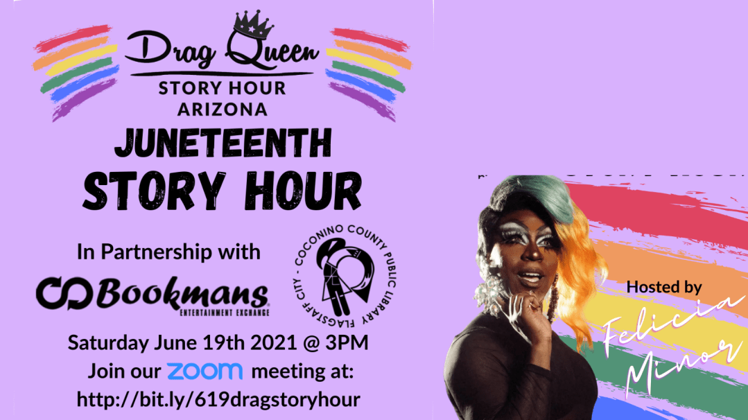 Join me for the Juneteenth Story Hour presented by Drag Story Hour – Arizona in partnership with Bookmans Entertainment Exchange and Flagstaff City – Coconino County Public Library. This story hour will be streamed live on Saturday, June 19 at 3 p.m. PDT/Arizona time.