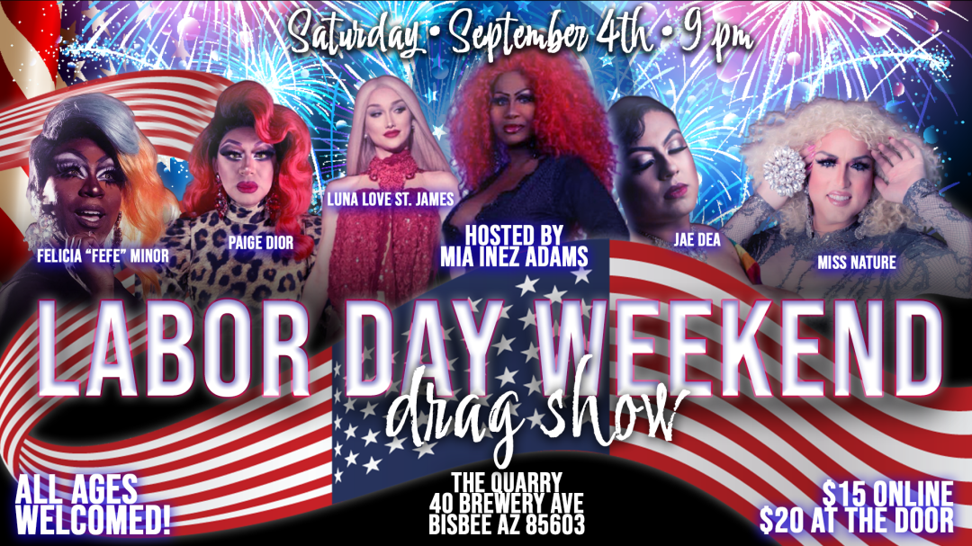 There will be performances by Paige Dior, Valentina Knowles, Mia Inez Adams, Jae Dee, Miss Nature and me! Be sure to get your tickets online at www.eventbrite.com/e/bisbee-labor-day-weekend-drag-show-tickets-157544757611. Tickets are $15 online and $20 at the door on the day of the event.