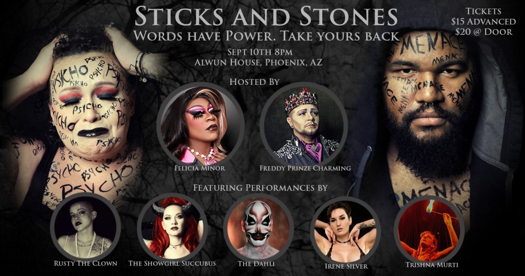 Holly Shoemaker’s Sticks and Stones project gives the subjects of each piece is a chance to reclaim the power behind a word that might have left that mark on their lives, that they have carried around forever. On Fri., Sept. 10, join Freddy Prinze Charming and me for the kick-off show at Alwun House. The show, which starts at 8 p.m., features performances from Rusty the Clown, The Showgirl Succubus, The Dahli, Irene Silver, and Trishna Murti.