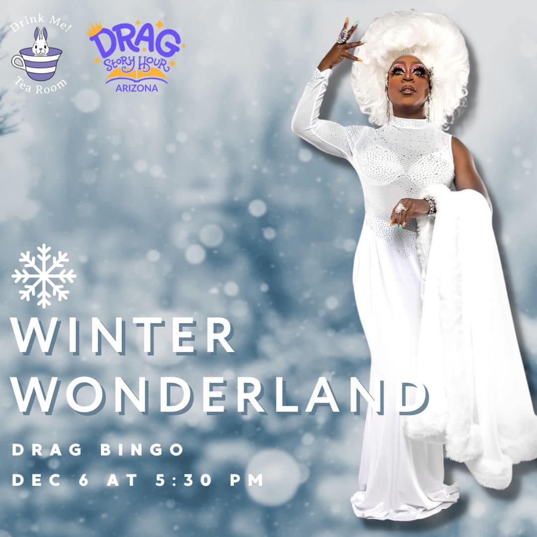 Immerse yourself in the magical Winter Wonderland of laughter as I, Felicia Minor, host a fabulous evening of Drag Bingo at Tempe’s Drink Me Tea Room!